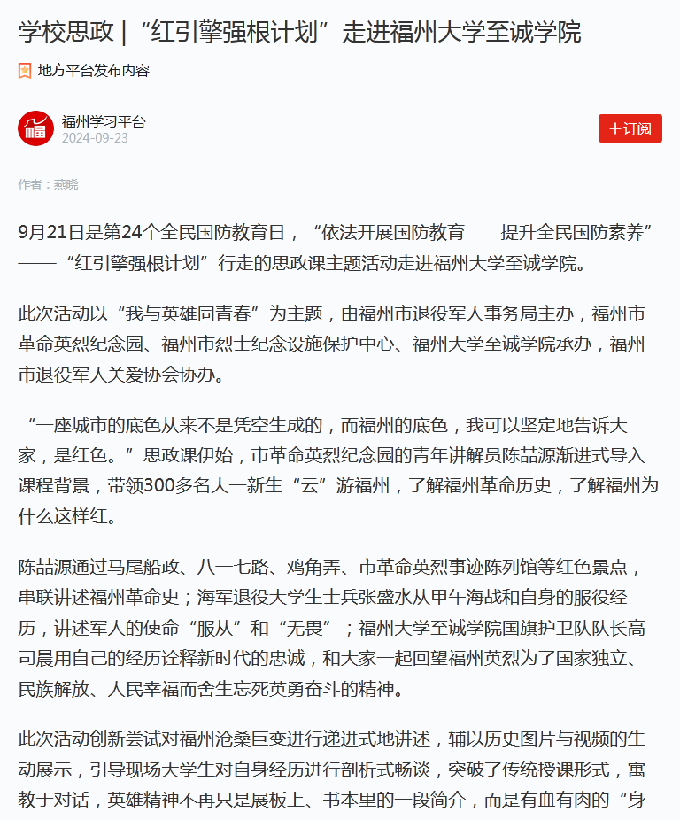 承办,福州市退役军人关爱协会协办。 “一座城市的底色从来不是凭空生成的,而福州的底色,我可以坚定地告诉大家,是红色。”思政课伊始,市革命英烈纪念园的青年讲解员陈喆源渐进式导入课程背景,带领300多名大一新生“云”游福州,了解福州革命历史,了解福州为什么这样红。 陈喆源通过马尾船政、八一七路、鸡角弄、市革命英烈事迹陈列馆等红色景点,串联讲述福州革命史;海军退役大学生士兵张盛水从甲午海战和自身的服役经历,讲述军人的使命“服从”和“无畏”;av在线