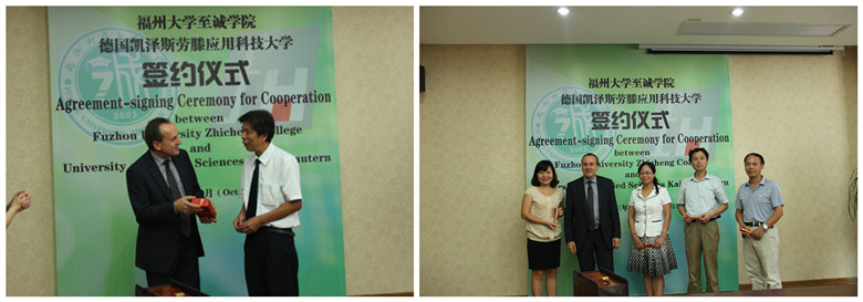 签约仪式后,双方互赠礼物并合影留念。随后,代表团一行还在院领导的陪同下参观了学院的学生荣誉室、图书馆、学生创新中心、第一实验实训中心等地。10月11日上午,代表团一行还将与德国留学合作项目的2013级物流管理系学生见面,并参观学院相关合作系。