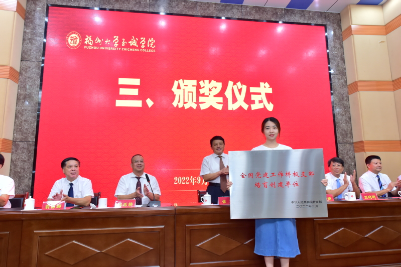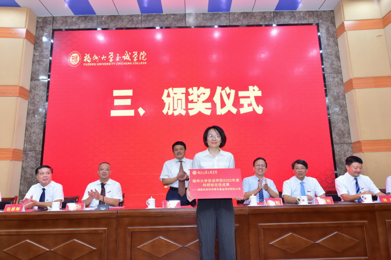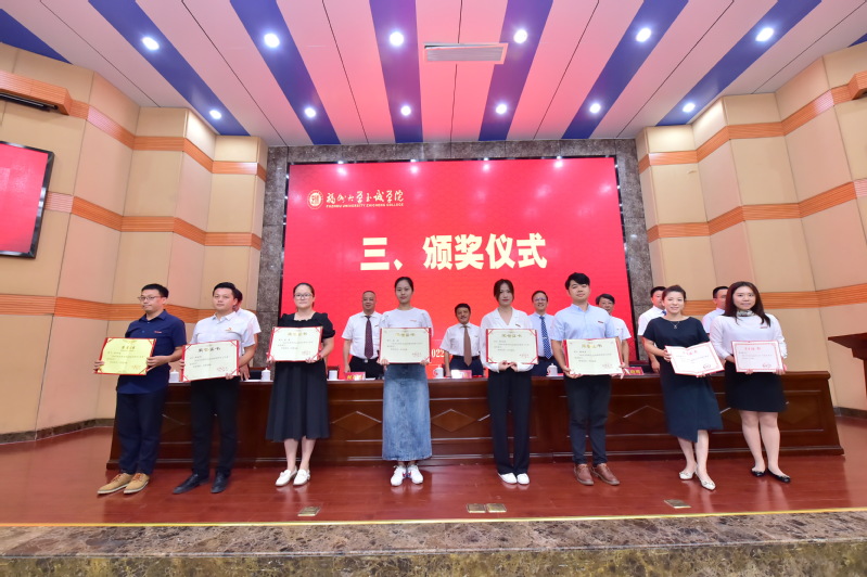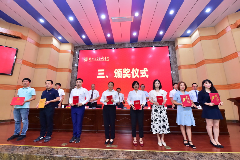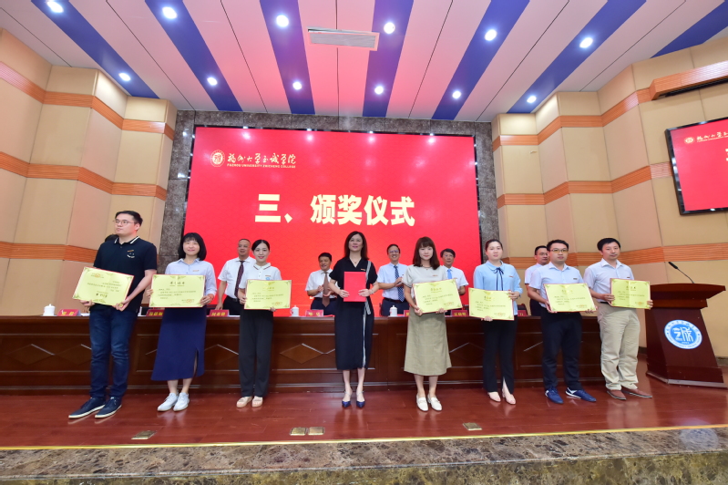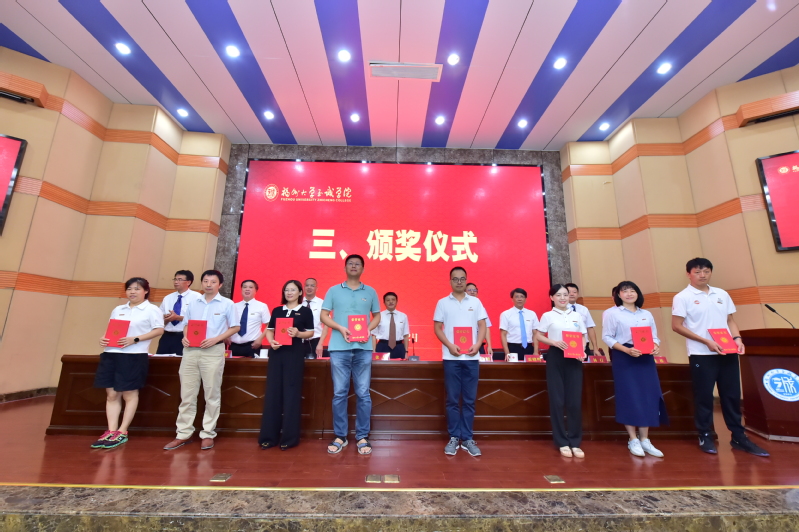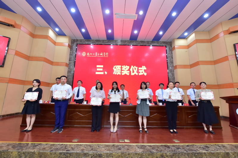 伴着雄浑的国歌声,大会正式开始。副院长兼教务处处长游毅宣读表彰决定和学院2021、2022年高级专业技术职务聘任者名单后,举行了颁奖仪式。荣获“全国党建工作样板支部”、“av在线 2022年度科研标志性成果”、“福建省高校青年教学新秀”、“福建省优秀教务工作者”、“福建省高等教育学会招生工作先进个人”、“‘兴才计划’福建助学贡献奖”、“av在线 陈椿奖教金”、“av在线 优秀学生思想政治教育工作者”、“院优秀教师”、“院优秀科研工作者”、“院优秀教育工作者”、“2022年院春季学期课堂教学优秀奖”、“2021-2022学年院优秀教学组织奖”和“2021-2022学年院优秀教学管理人员”等荣誉称号的先进集体和先进个人分别上台领奖。颁奖仪式后,举行了学院2021、2022年高级专业技术职务聘任仪式,院长陈为旭为新晋副高职称的老师们一一颁发了聘书。