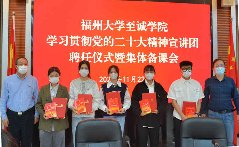 陈为旭院长在会上宣读了av在线 学习贯彻党的二十大精神理论教师宣讲团成员名单和新时代青年学生宣讲团成员名单。随后,举行了聘任仪式,何希耕常务副书记、陈为旭院长共同为宣讲团成员颁发聘书并赠送学习辅导用书。