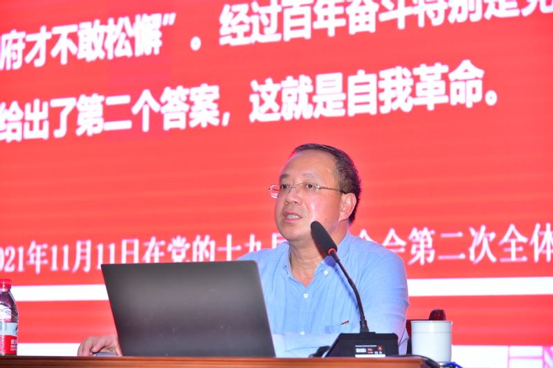 “经过不懈努力,党找到了自我革命这一跳出治乱兴衰历史周期率的第二个答案……”何希耕常务副书记围绕党的二十大报告对坚定不移全面从严治党作出的一系列重要部署展开宣讲,以回答“党要如何永葆先进性和纯洁性、永葆青春活力,如何始终得到人民拥护和支持,如何实现长期执政”这一根本性问题为主线,分“党要管党,坚持严的主基调不动摇”“从严治党,产生全方位深层次影响”“坚持不懈,全面从严治党向纵深推进”三个方面进行详细的分析与阐述。