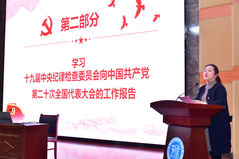 随后,翁德顺纪委书记作了题为《驰而不息加强作风建设,纵深推进全面从严治党》的报告,紧扣作风建设主题,从“坚定不移全面从严治党,以党的自我革命引领社会革命”“驰而不息加强作风建设,坚持以严的基调强化正风肃纪”“持之以恒抓反腐败工作,以更实举措弘扬至诚新风正气”三个方面宣讲党的二十大精神,深入探讨全面从严治党的重要时代价值和深远历史意义。他指出,全面从严治党、加强作风建设,是党永葆生机活力的必由之路。他结合学院工作实际,分析了新时代学院管党治党的新要求、新部署和新形势,强调建设高素质专业化纪检监察干部队伍是推动新时代纪检监察工作高质量发展的关键,也是健全学院全面从严治党体系的重要工作。翁德顺纪委书记总结回顾了近年来学院全面从严治党和党风廉政建设情况,并对学院下一阶段全面从严治党特别是加强作风建设工作作出了部署。