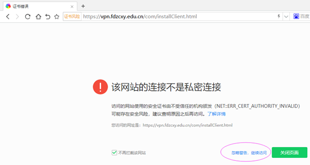 如跳出如下界面,请选择“忽略警告,继续访问”