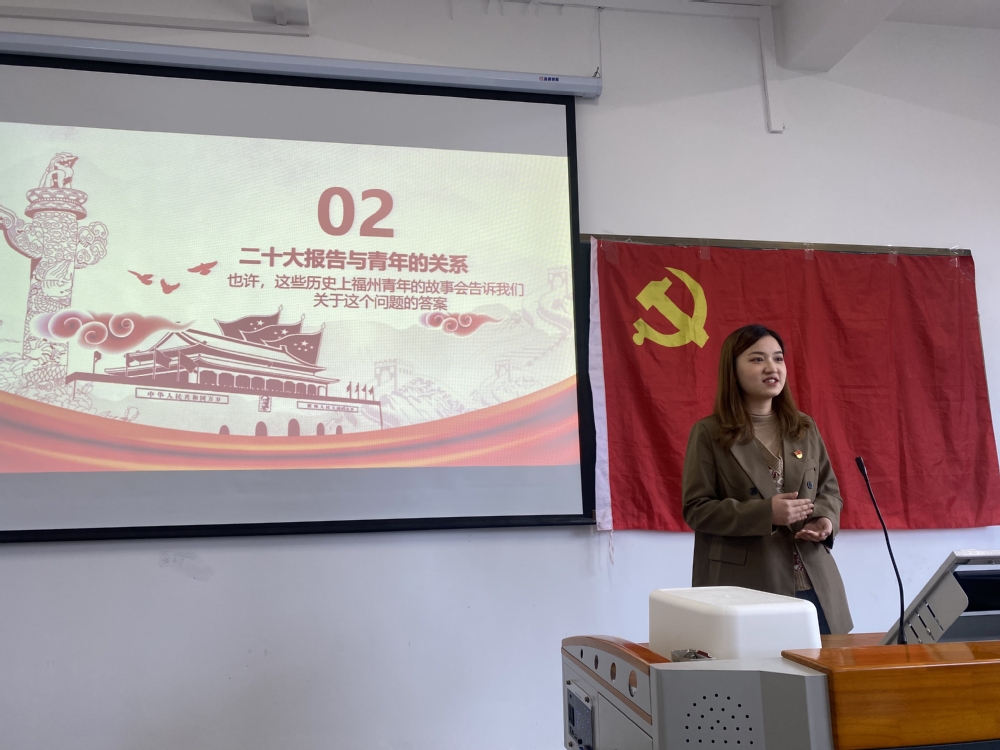 方雅琳同学以“学习党的二十大报告 感悟新时代青年的初心与使命”为主题,向同学们宣讲“我们青年与党的二十大”的相关内容。方雅琳同学从“何为党的二十大报告”“党的二十大报告与青年的关系”“党的二十大报告中带来的思考”“党的二十大报告对青年的指导意义”四个方面出发,结合自身实际,向同学们阐述了她作为当代青年对于二十大精神的理解,通过列举三坊七巷中的历史人物,让同学们更加深刻地体会到了学习宣传贯彻二十大精神要从身边一点一滴小事做起,作为青年应深入学习贯彻二十大精神,不断充实自己。