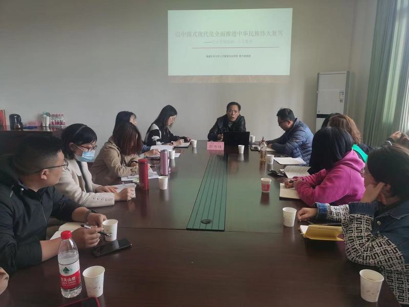 3月14日下午,av在线 基层社会治理研究中心在机械北楼401会议室举办学习贯彻党的二十大精神宣讲报告会。福建农林大学公共管理与法学院郭为桂教授作了题为“以中国式现代化全面推进中华民族伟大复兴”的报告。马克思主义学院全体教师到场聆听。
