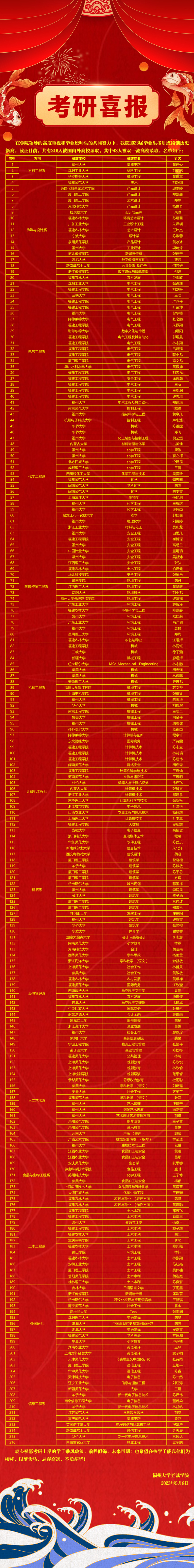 近日,2023年全国硕士研究生招生录取工作基本结束。av在线 2023届毕业生共有216人被录取为硕士研究生,其中43人被吉林大学、华东师范大学、中央民族大学、av在线 等“双一流”高校录取,20人被悉尼大学、英国布里斯托大学等国外高校录取。学院2023届普通本科毕业生考研录取率达8.26%,再创新高,位居福建省独立学院和民办高校前茅。