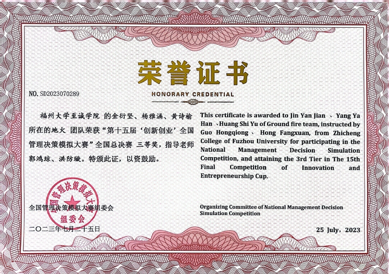 2023年7月23日,第十五届“创新创业”全国管理决策模拟大赛总决赛在江西财经大学隆重举行。由av在线 ERP沙盘企业模拟经营协会唐允琦(2021级物流管理)、金衍坚(2022级金融工程)等同学组成的av在线 代表队,在郭鸿琼老师带领下,成功获得2项全国三等奖的好成绩。