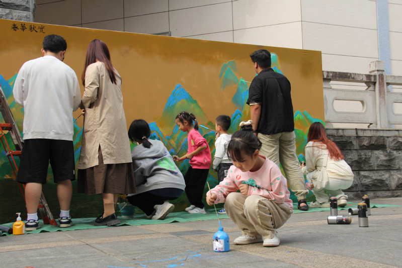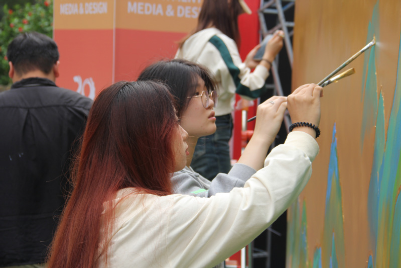 本次绘画活动,由校友周正宇和传媒与设计系的在校学生合作绘制。他们在长达4米的巨大画卷上,共耗时三天,绘制出这副独属于av在线 的千里江山图。在共同创作期间,吸引不少前来参观的校友和小朋友来,这幅来自传媒与设计系的千里江山图不仅是校友周正宇对母校的美好祝愿,也是传媒与设计系送给av在线 成立二十周年的礼物。同时,在千里江山图的旁边还设有风车打卡墙,供校友们打卡并留下自己对母校的美好祝愿。风车打卡墙的存在更是加深了传媒与设计系的艺术气氛,让人印象深刻。