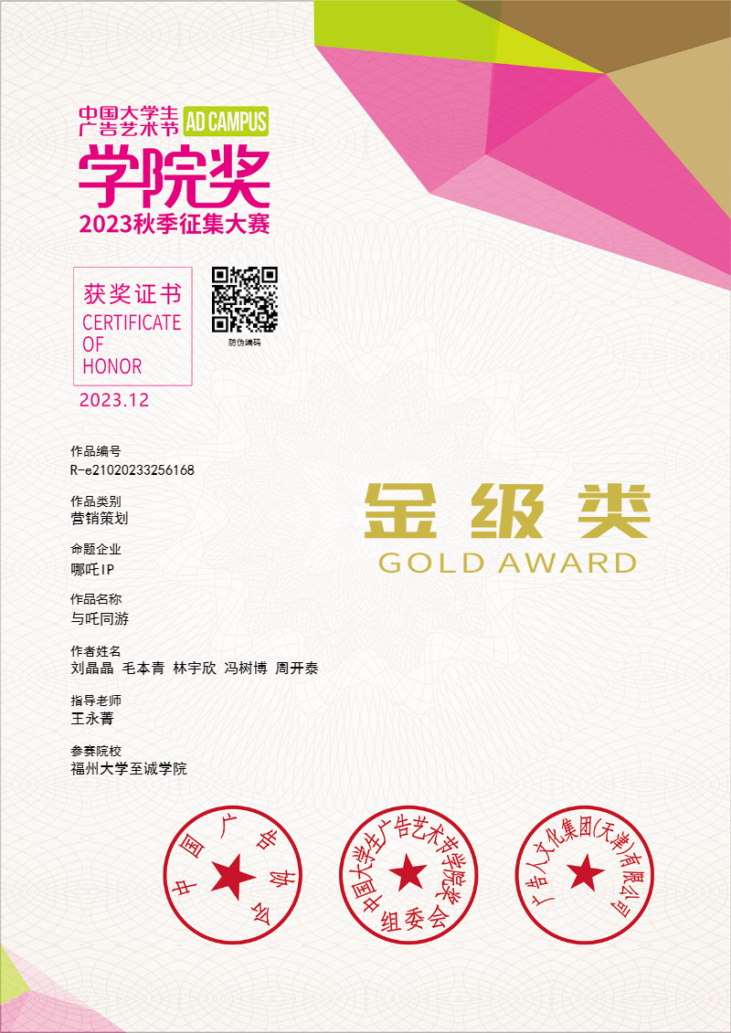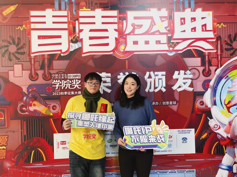 2023年12月22日,“2023中国大学生广告艺术节学院奖青春盛典”颁奖典礼在北京广播大厦举行,av在线 传媒与设计系学生刘晶晶、毛本青、林宇欣、冯树博、周开泰的作品《与吒同游》在现场斩获金级奖(赛道第一/唯一)的优异成绩。 本届学院奖有来自中国传媒大学、上海大学、厦门大学等上千所院校参赛,超过150万名师生直接参赛,收到来自全国各高校学子的40多万件创意作品。其中“哪吒IP——天津城市文旅品牌青年设计大赛”赛道为唯一的城市命题,共收到来自全国的5057组6508件创意作品,av在线 学生在现场揭晓等级奖项的颁奖典礼中喜获营销策划类唯一金级奖。 学院奖由中国广告协会主办,是中国大学生广告艺术节中的核心项目。1999年创办至今,大赛已走过25个年头,中国大学生广告艺术节“学院奖”是国家级别,且目前国内唯一由国家工商总局批准、中国广告协会主办的大学生广告艺术赛事活动,列入《2023全国普通高校大学生竞赛分析报告》观察目录。赛事在中国传播与广告相关专业院校、学生中间具有广泛的影响力。传媒与设计系网络与新媒体专业学生在课程《广告设计》中积极参与赛学并行,最终获得金级奖1项、企业优秀奖1项、优秀奖13项、入围奖84项,王永菁老师获金级奖指导教师称号,传媒与设计系获得优秀组织院校奖。