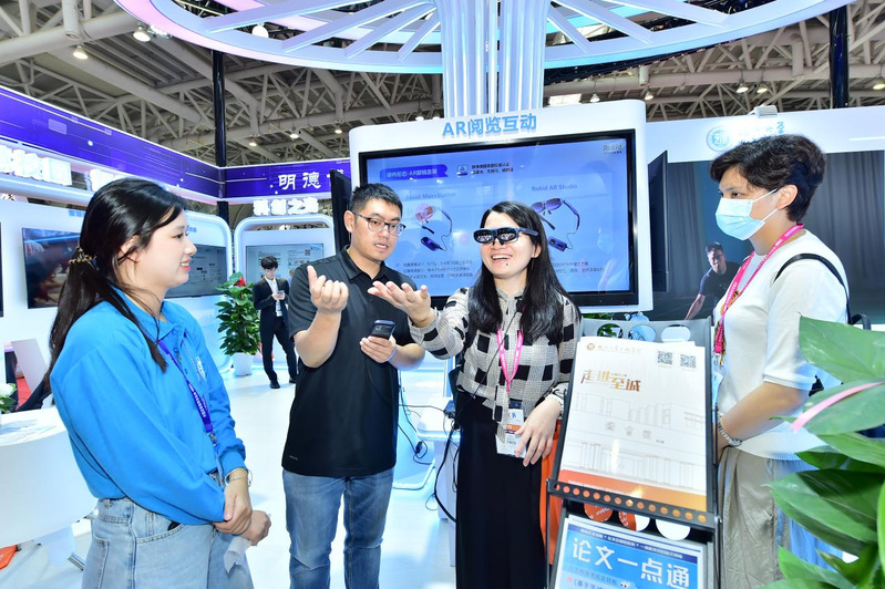 近年来的教育教学成果。展台以数字校园为主体,重点围绕产教融合、学生科创成果等内容进行展览展示,并设有AR阅览、边缘智能应用实验平台、数字孪生等互动交流和体验区,吸引了众多领导、嘉宾、展商及高校师生驻足参观、交流、体验,受到各方肯定。