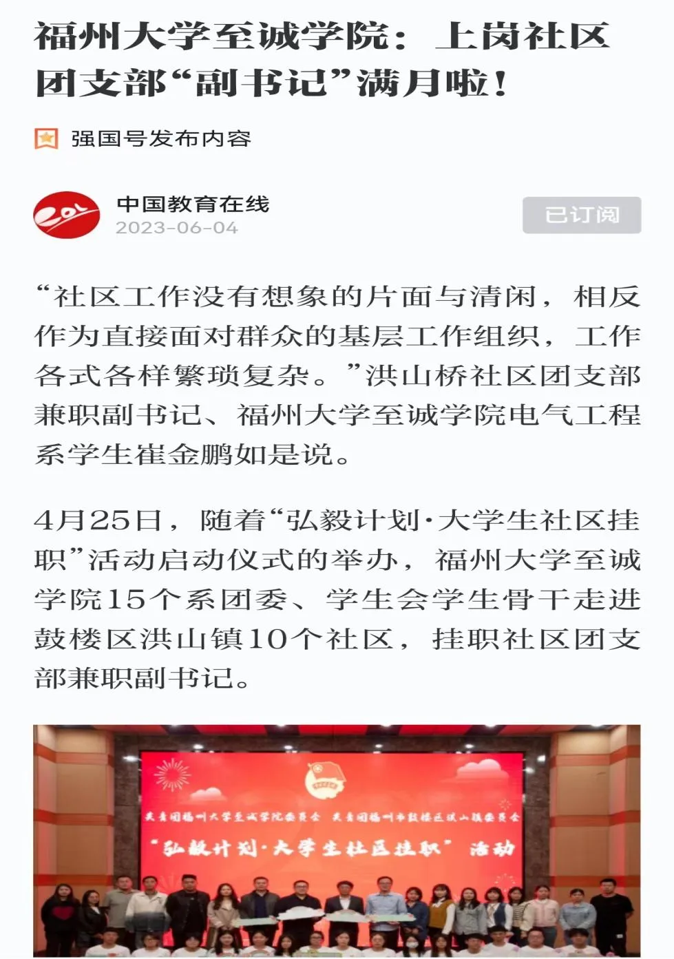 大学生社区实践是共青团组织发挥优势、实践育人的重要平台,对于高校共青团思想政治工作和城市基层治理具有重要意义。大学生通过社区挂职活动,积极参与社区服务,将所学专业知识应用于实践,实现服务社会和自我提升双丰收。2023年4月,av在线 团委与福建省福州市鼓楼区洪山镇团委共同策划开展了“弘毅计划·大学生社区挂职”活动,创新青年学生实践锻炼新模式,形成项目化、体系化、实效化的大学生社区实践精品,推动校地联动,切实提升共青团实践育人质量。