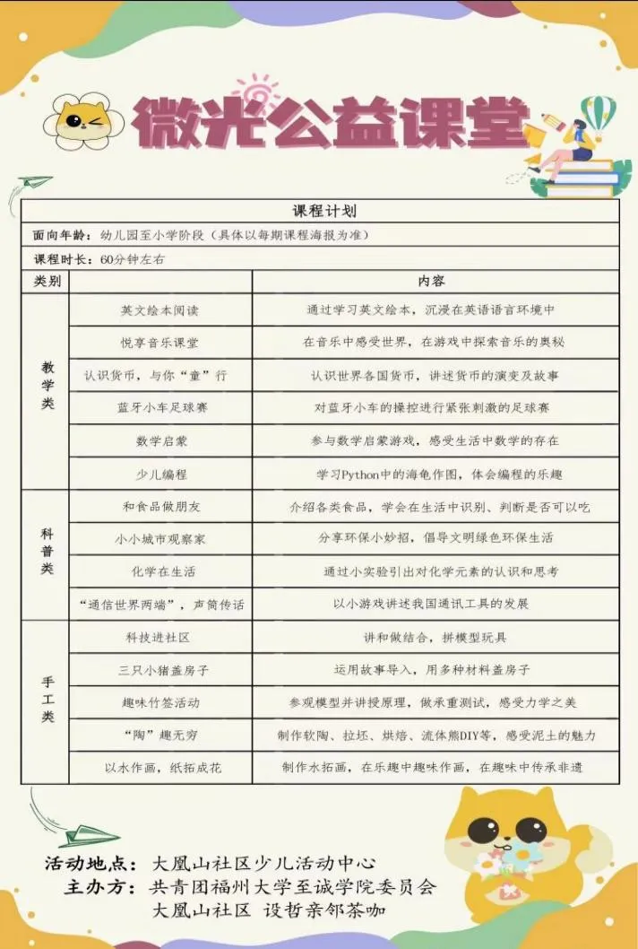 2023年10月,学院团委依托大凰山社区打造社区实践示范点,开设“微光公益课堂”大学生社区托管服务项目,av在线