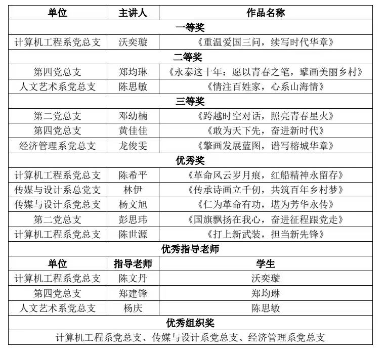 经过激烈角逐,来自计算机工程系党总支的沃奕璇获得一等奖,来自第四党总支和人文艺术系党总支的郑均琳和陈思敏分获二等奖,来自第二党总支、第四党总支和经济管理系党总支的邓幼楠、黄佳佳和龙俊雯分别获三等奖,陈希平等5位选手获优秀奖。陈文丹、郑建锋等3位老师获大赛优秀指导老师称号。计算机工程系党总支、传媒与设计系党总支和经济管理系党总支获大赛优秀组织奖。