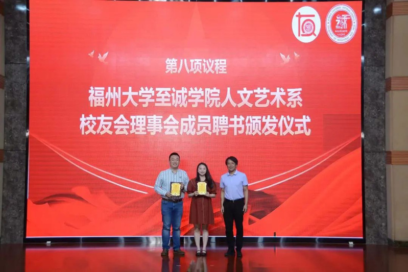 随后,陈为旭研究员与人文艺术系主任魏德毓为人文艺术系校友会揭牌,与会领导嘉宾为系校友会理事会成员颁发聘书,潘超老师向大家分享人文艺术系校友会会歌,并由陈为旭研究员和王微微校友共同启动会歌。