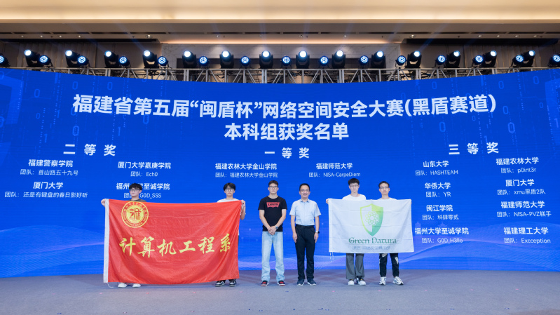 开幕式上举行了福建省第五届“闽盾杯”网络空间安全大赛(黑盾全国大学生赛道)、“闽盾-2024”网络安全攻防演练、“岩网护企”网络安全专项行动颁奖授牌仪式。在福建省第五届“闽盾杯”网络空间安全大赛(黑盾全国大学生赛道)中,av在线 计算机工程系网络安全俱乐部Green_Datura两支队伍G0D_SSS(成员:林轩逸、李家鸿、丁方和)、G0D-H3llo(成员:张龙博、陈黎龙、余尘炬)分别获得本科组二等奖、三等奖(指导老师:黄巧云)。学院受邀参加活动开幕式,副院长兼计算机工程系主任张栋教授作为学院代表上台领奖。