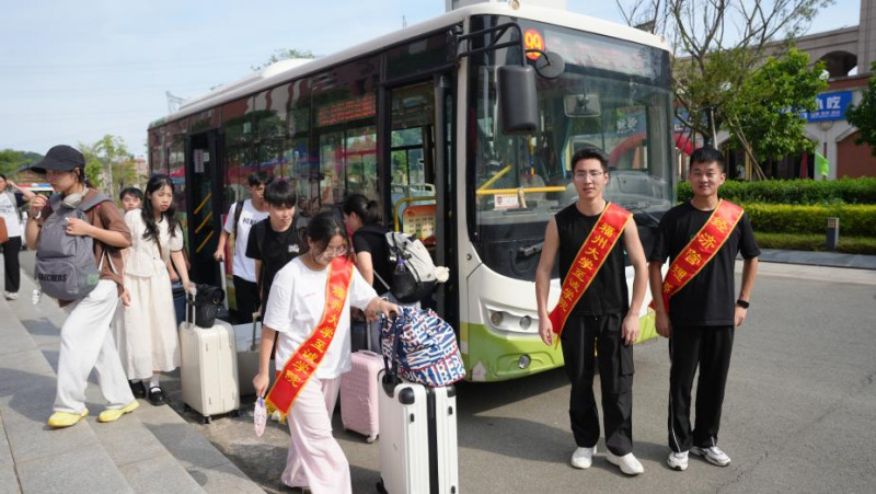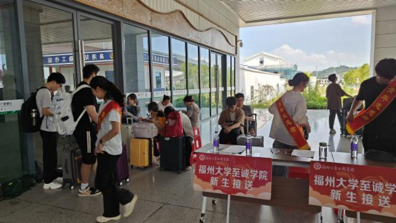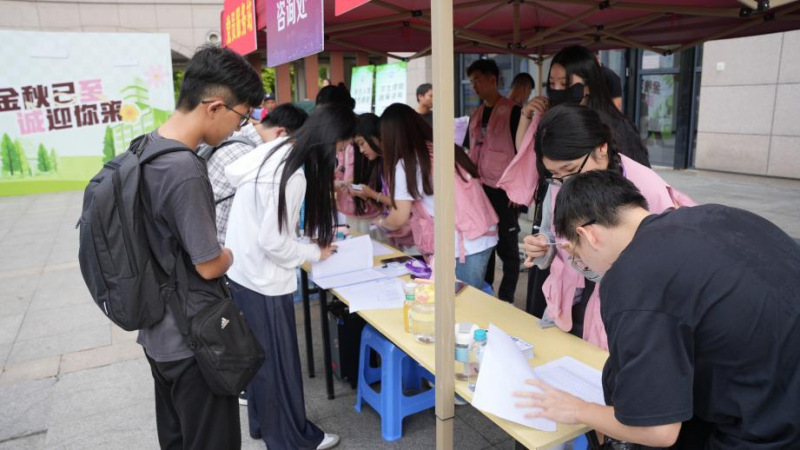 学生志愿者为新生指引路线、搬运行李、热情解答问题