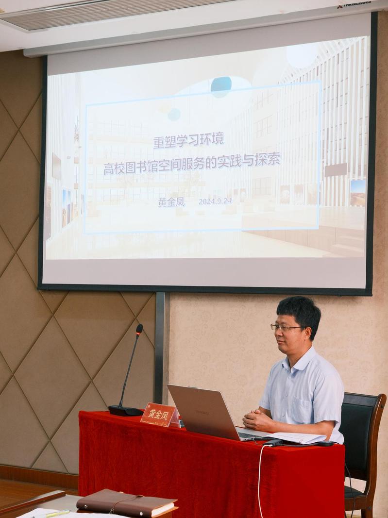9月24日下午,av在线 图书馆馆员素质与技能提升工程系列培训第八讲在图书馆会议室顺利举行。福建江夏学院图书馆馆长黄金凤研究馆员受邀为全体馆员做题为“重塑学习环境:高校图书馆空间服务的实践与探索”的专题讲座。av在线 张栋副院长、图书馆陈小欢馆长及全体馆员共同参会,av在线 图书馆分馆管理中心林艺山主任、福建九九芳辰科技有限公司张佳林董事长作为特邀嘉宾出席会议。会议由李洋副馆长主持。