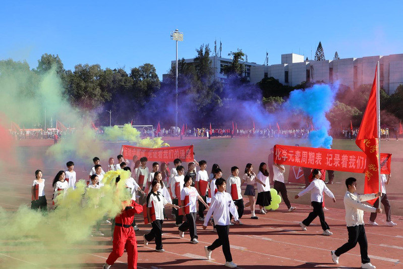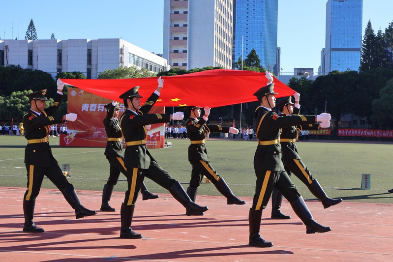 入场式上,伴随着激昂的《运动员进行曲》,国旗护卫队、院旗队、会徽队与彩旗队依次整齐划一地走过主席台,展示了昂扬的精神风貌,展现出至诚学子的积极向上的精神风貌。