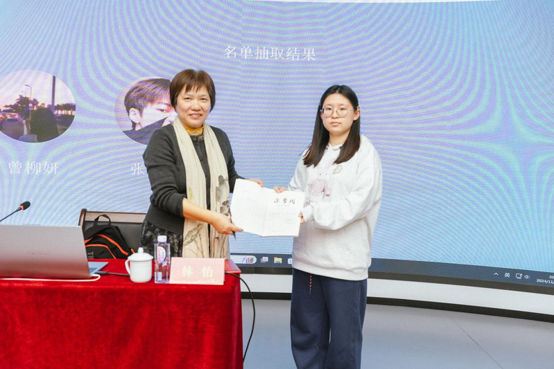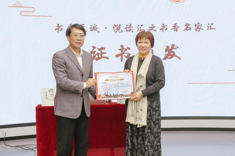 雷晓明副院长为林怡教授颁发“书香至诚·悦读汇”之“书香名家汇”讲座证书