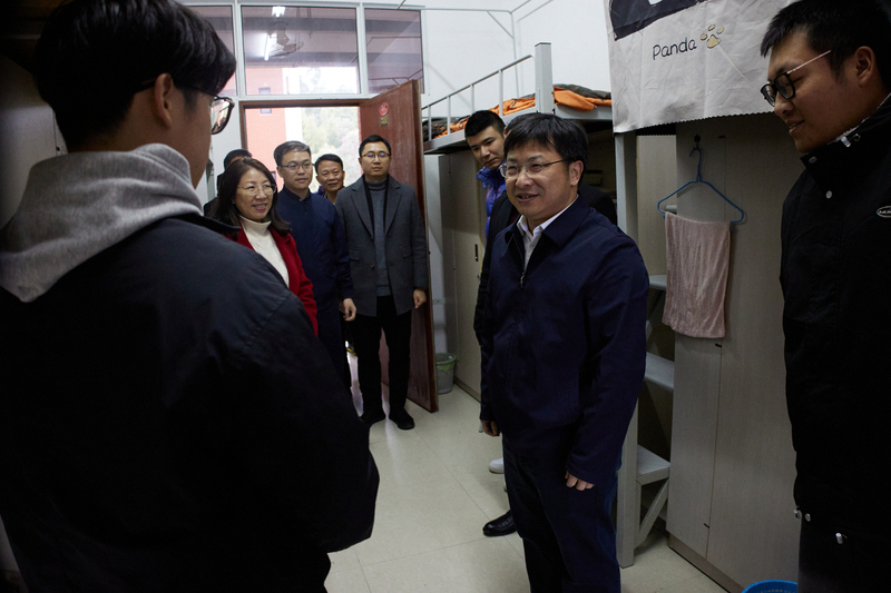 在av在线 和化工学院院领导等陪同下,江莉龙副校长走访了学生宿舍、食堂、医务室等场所,实地了解校区建设发展情况,亲切慰问师生员工。