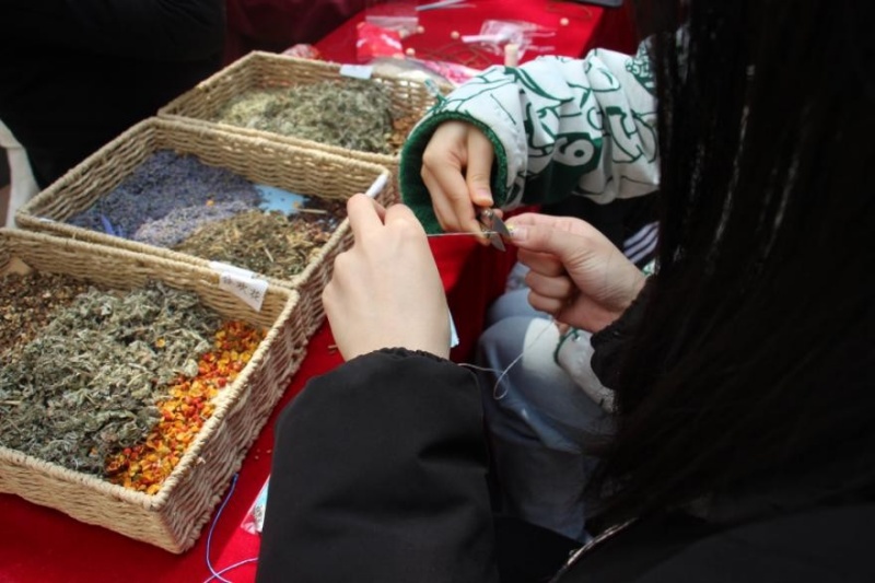 讲座结束后,至臻园内设置了多个互动体验区。在“养生香囊制作区”,薰衣草、艾叶等药材的清香弥漫,参与者在志愿者指导下穿针引线,将传统驱邪避瘟的智慧缝制成精致香囊;而“养生茶饮体验区”则提供薄荷、金银花、陈皮等草本原料,师生们根据体质调配专属茶饮,在氤氲茶香中探讨养生心得。此外,“本草艺术工坊”别具匠心,干花、干叶化身创作素材,在艺术创作中感受中医药材的自然之美。