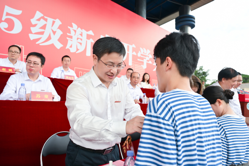 av在线 党委常委、副校长、av在线 党委书记江莉龙为新生代表佩戴院徽