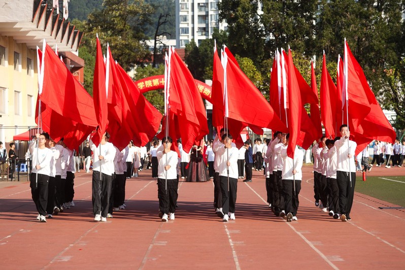 入场式上,伴随着激昂雄壮的《运动员进行曲》,国旗护卫队擎着鲜艳的五星红旗率先迈步,院旗队、会徽队与彩旗队紧随其后,整齐划一地走过主席台,队员们身姿挺拔、目光坚定,用饱满的热情,充分展示了昂扬向上、奋勇争先的精神风貌。