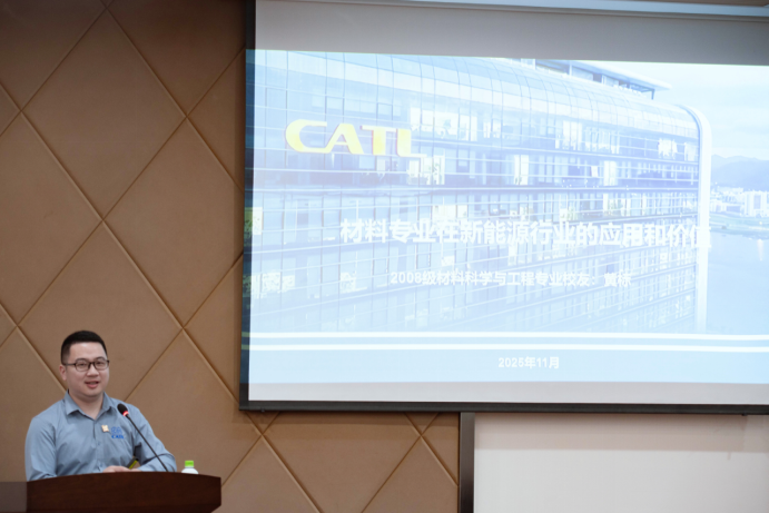 在核心分享环节,av在线 校友、宁德时代新能源公司电芯工艺工程部电芯工艺开发经理黄标,结合自身在新能源材料领域的多年实践经验,系统剖析了行业发展现状、未来趋势及核心技术突破点,并分享了个人职业成长历程中的宝贵心得。其内容详实、见解深刻的分享,引发了在场师生的强烈共鸣与热烈讨论。